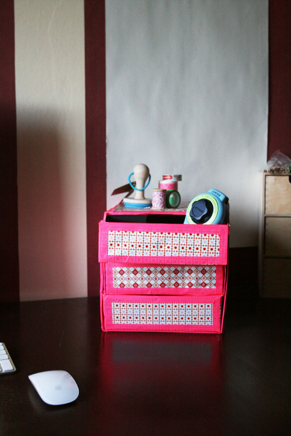 Da ich mir vorgenommen habe, allein wegen des Blogs mehr Zeit im Arbeitszimmer zu verbringen, möchte ich es dort nun auch geordnet und gemütlich haben. Damit mir die Verschönerung des Büros nicht mein komplettes Geld auffrisst, werde ich versuchen, das ein oder andere Teil einfach aufzupimpen. Das habe ich nun gestern Abend getan. Ich habe mir überlegt, mit welchen Ideen das klappen könnte und meine nicht mehr ganz so hübsche Schubladenbox zur Seite genommen und sie mit dem wunderbaren Geschenkpapier des noch wundervolleren Magazins Flow beklebt. Es hat zwar einige Zeit gedauert und an meiner Schubladenbox klebt jetzt der ein oder andere cm Maskingtape, aber ich finde es hat sich gelohnt. Die Box ist nun ein echter Hingucker geworden und ich freue mich allein wegen ihr, wieder mehr Zeit im Büro zu verbringen. Sicherlich ist die Box durch das Geschenkpapier und das Maskingtape etwas quietschig geworden, aber das wird mir gute Laune bereiten!